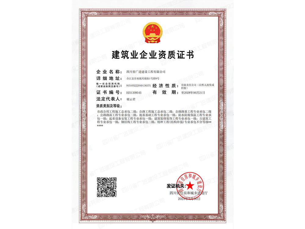 目前,公司建筑工程施工總承包資質(zhì)已升級為壹級資質(zhì),公司有職工280余人,有職稱人員113人(其中高級職稱3人、中級職稱32人、初級職稱78人);各類管理上崗人員40余人;大中專學(xué)歷85余人;高中專學(xué)歷120余人。企業(yè)法人代表兼總經(jīng)理:謝云君,注冊資金壹億伍仟萬元,下面設(shè)有一個分公司“四川省廣進(jìn)建設(shè)工程有限公司赤水分公司”,分公司地址:貴州省遵義市赤水市太平街。